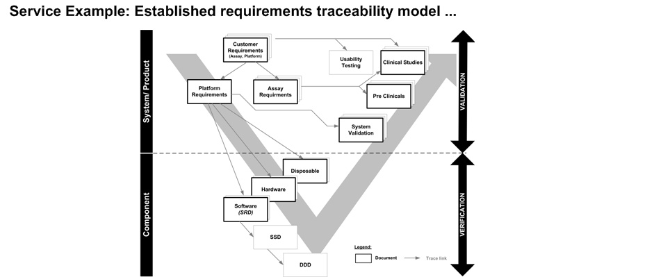 The Master Validation Plan provides a breakdown into all V&V activities (see layer model below) for a product (platform & assays) with its components, including manufacturing.